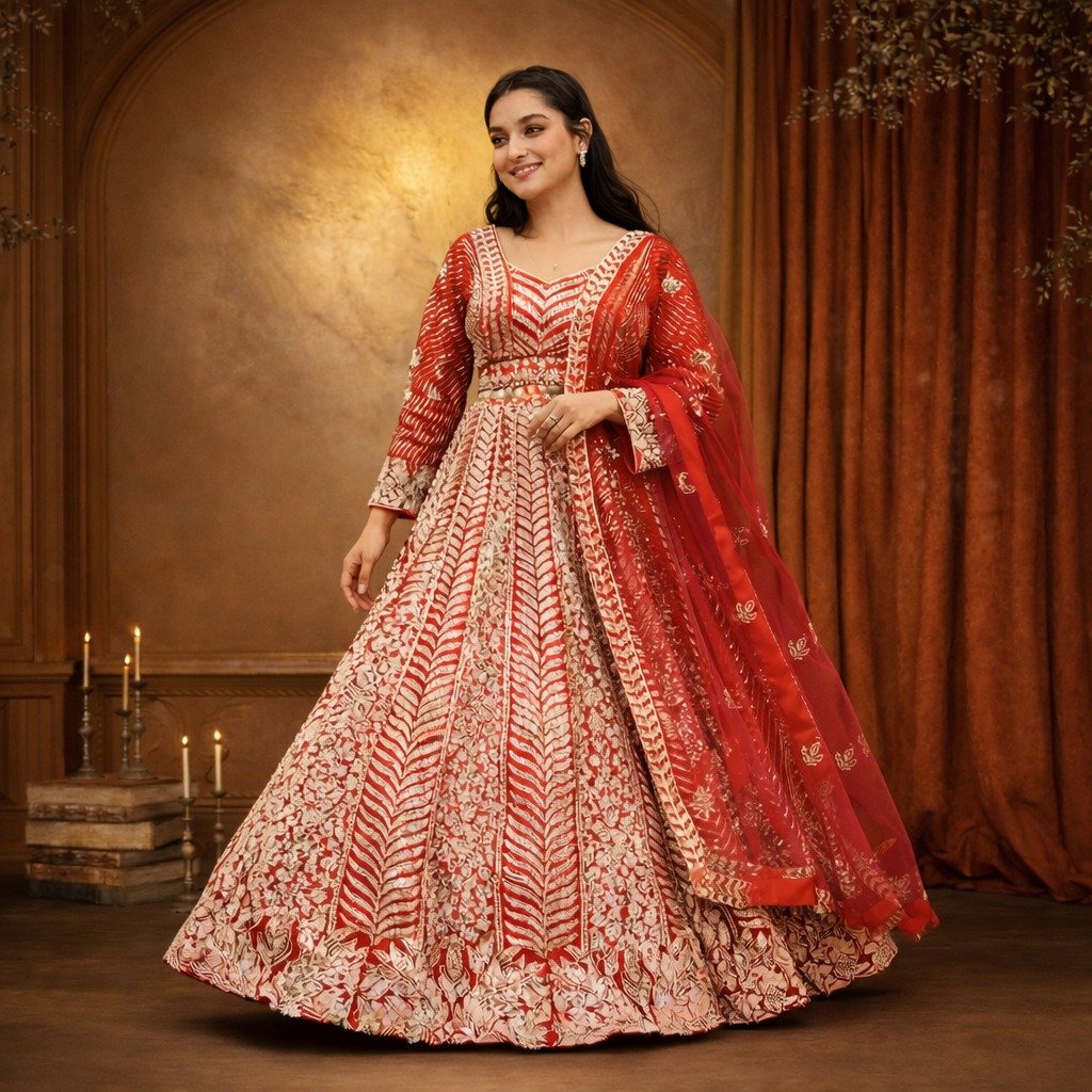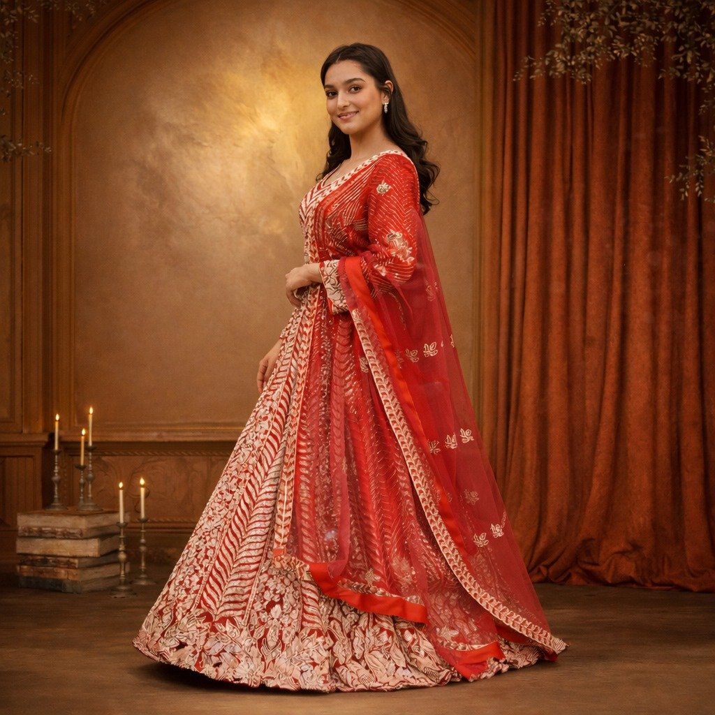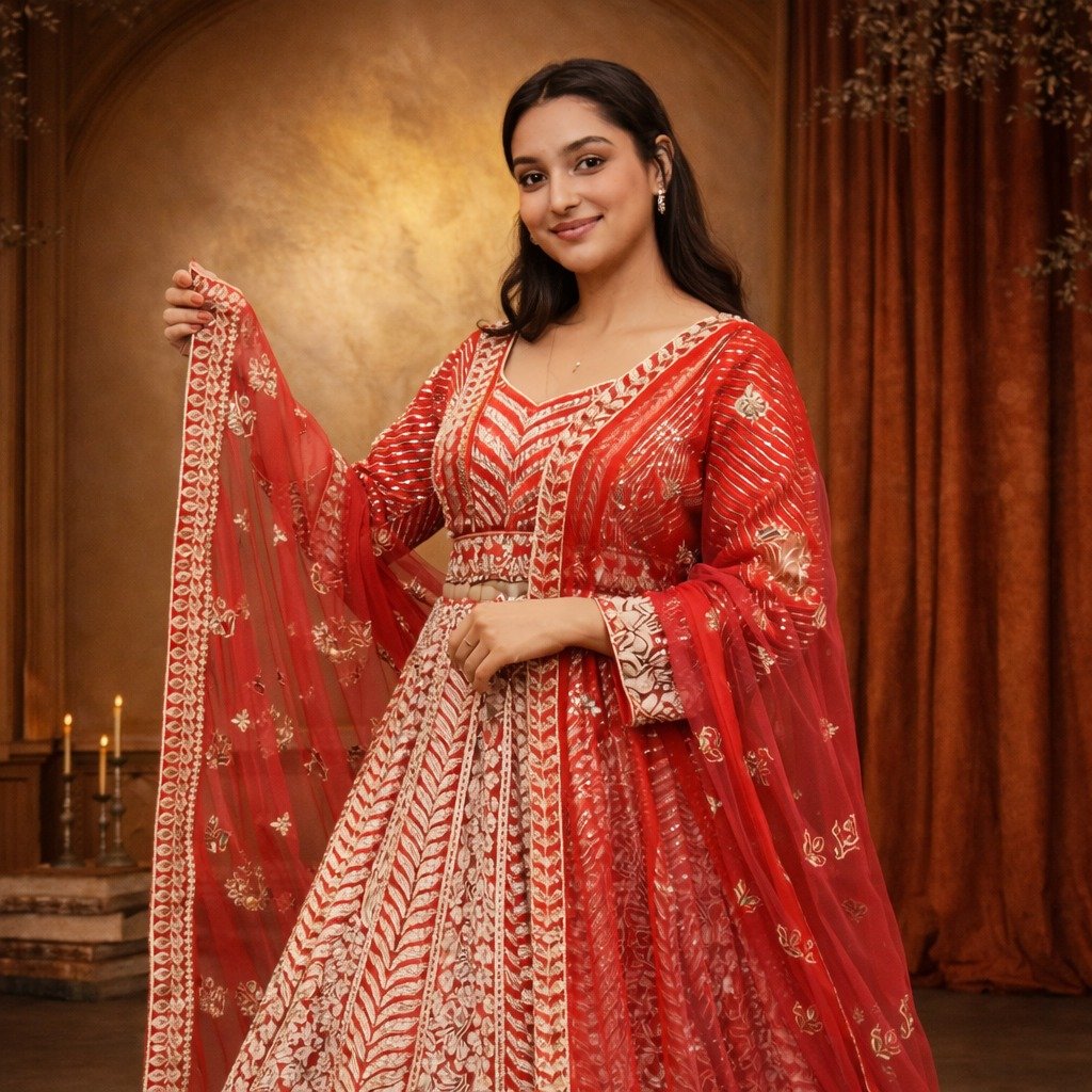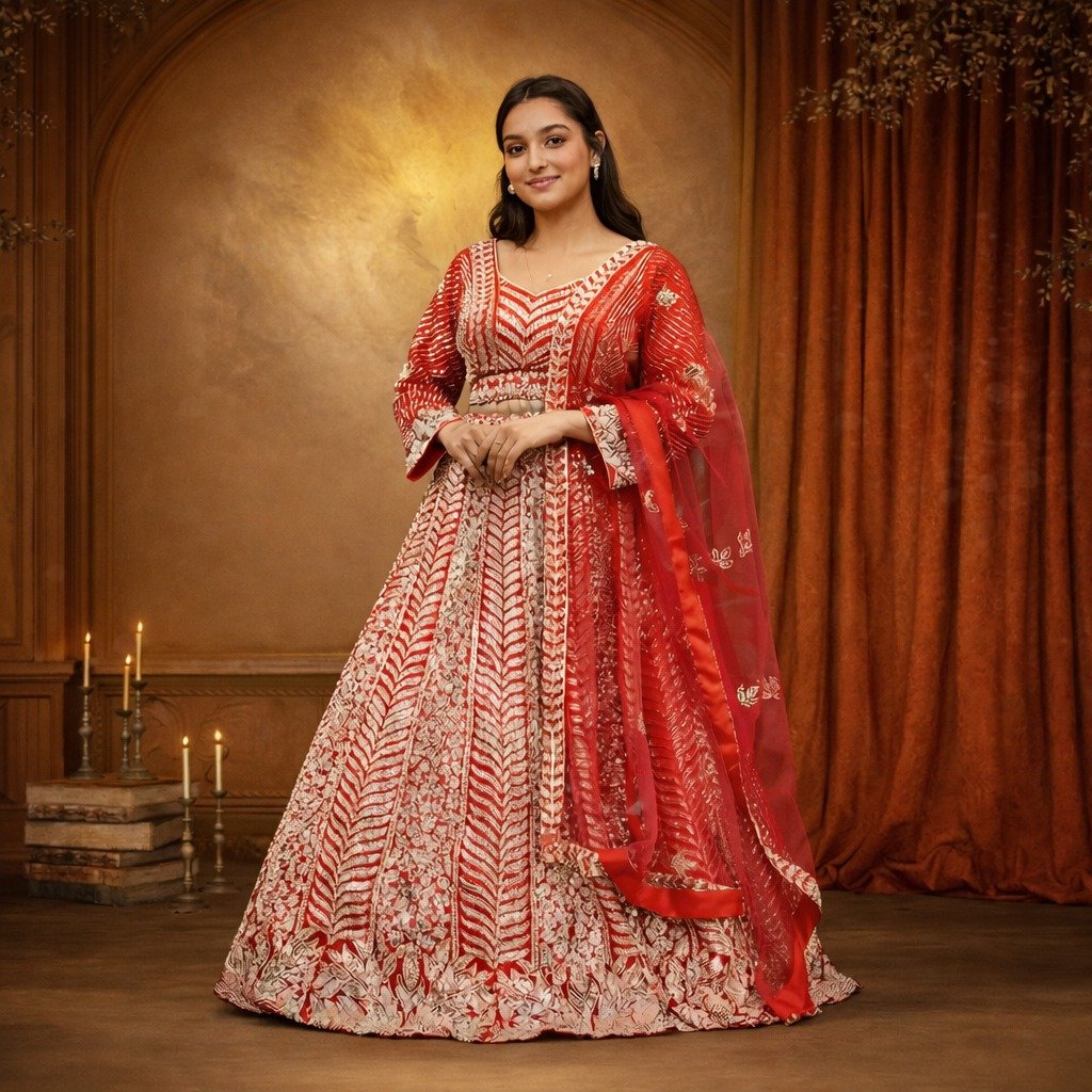1 = Fabric: Net 2 = Top Size: 41 (L) Extra Margin Available 3 = Lehenga Length: 45 Inch 4 = Waist: 38 5 = Sleeves: Full Sleeves 6 = Dupatta: 2.5 Mtr 7 = Embroidery: Handwork 8 = In Bag: Crop Top, Lehenga Bottom, Dupatta
