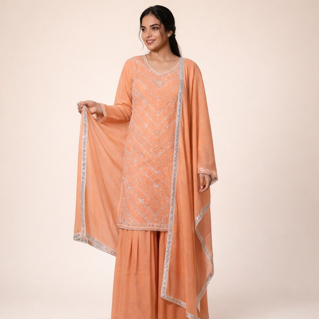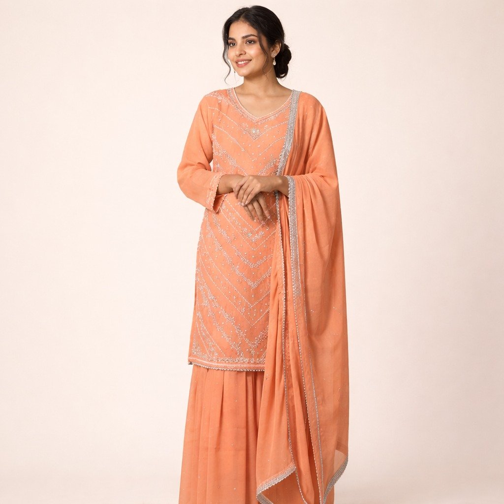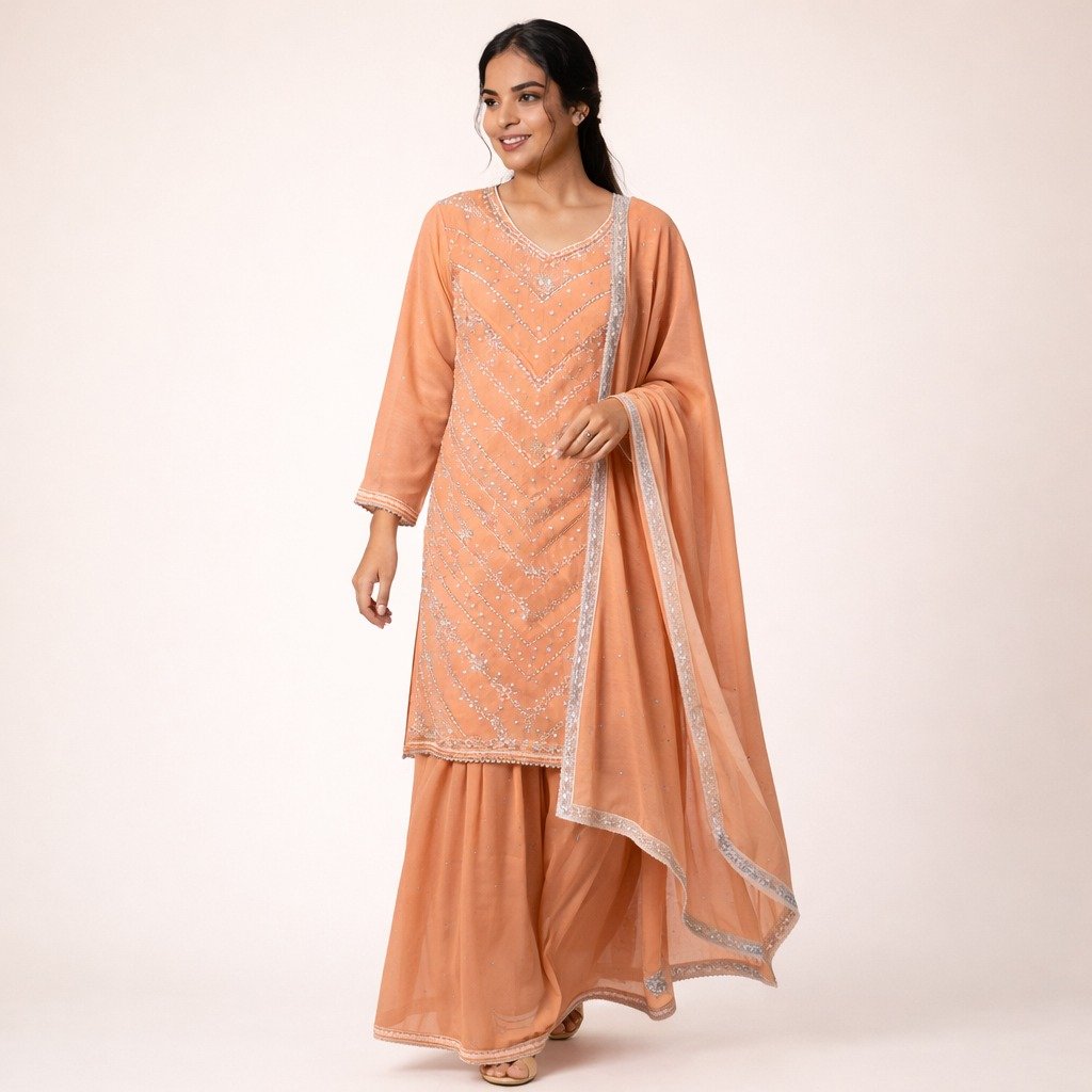 1 = Fabric: Star Georgette 2 = Top Length: 37 Inches 3 = Bottom Length: 43 Inches 4 = Dupatta: 2.5 Meter 5 = Style: Garara Suit 6 = Embroidery: Hand Work 7 = In Bag: Kurta, Garara and Dupatta Only 8 = Occasion: Wedding Wear, Party Wear, Festive Wear, Traditional Wear