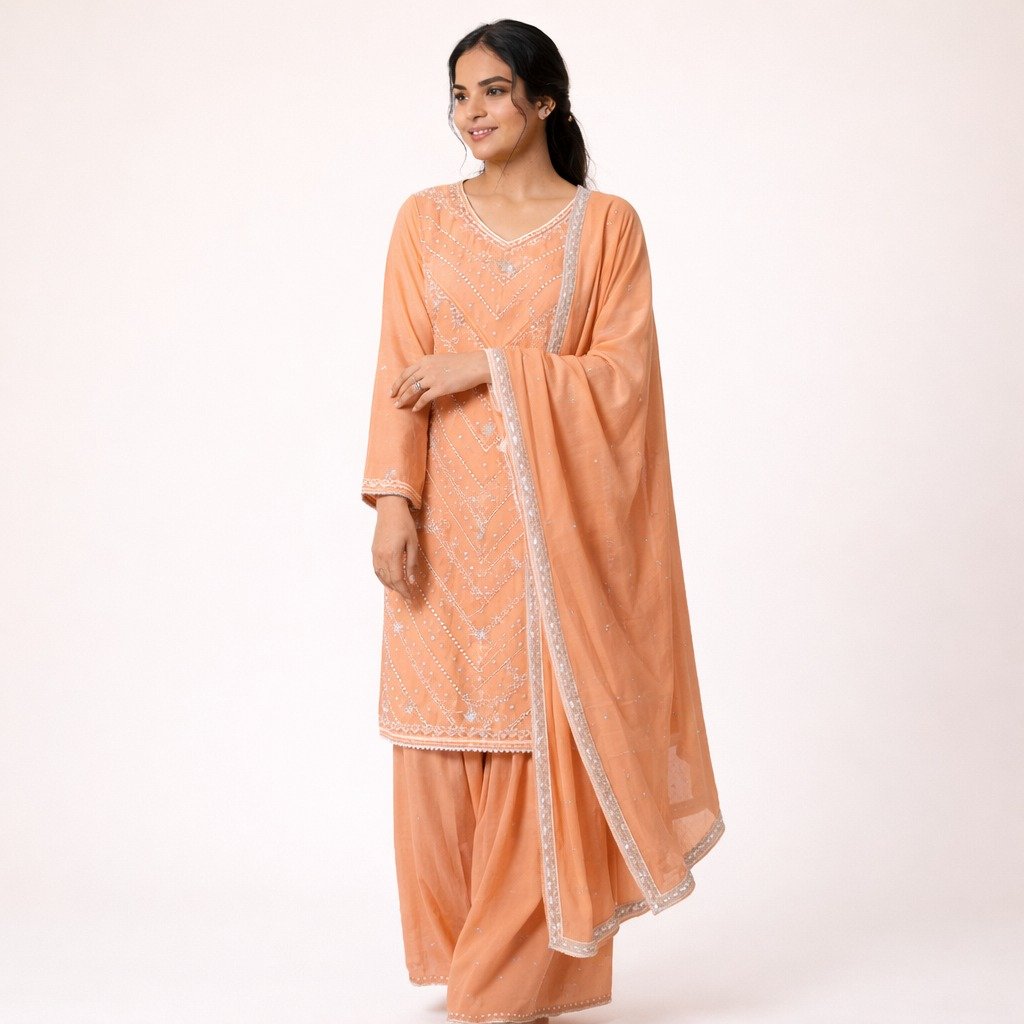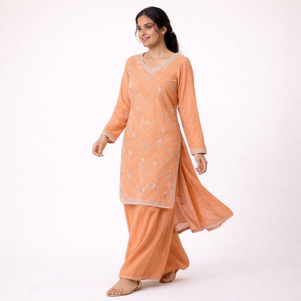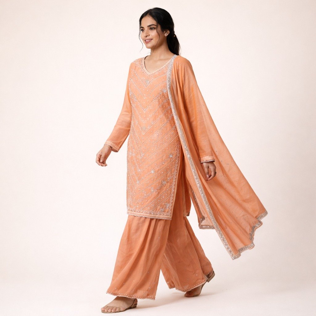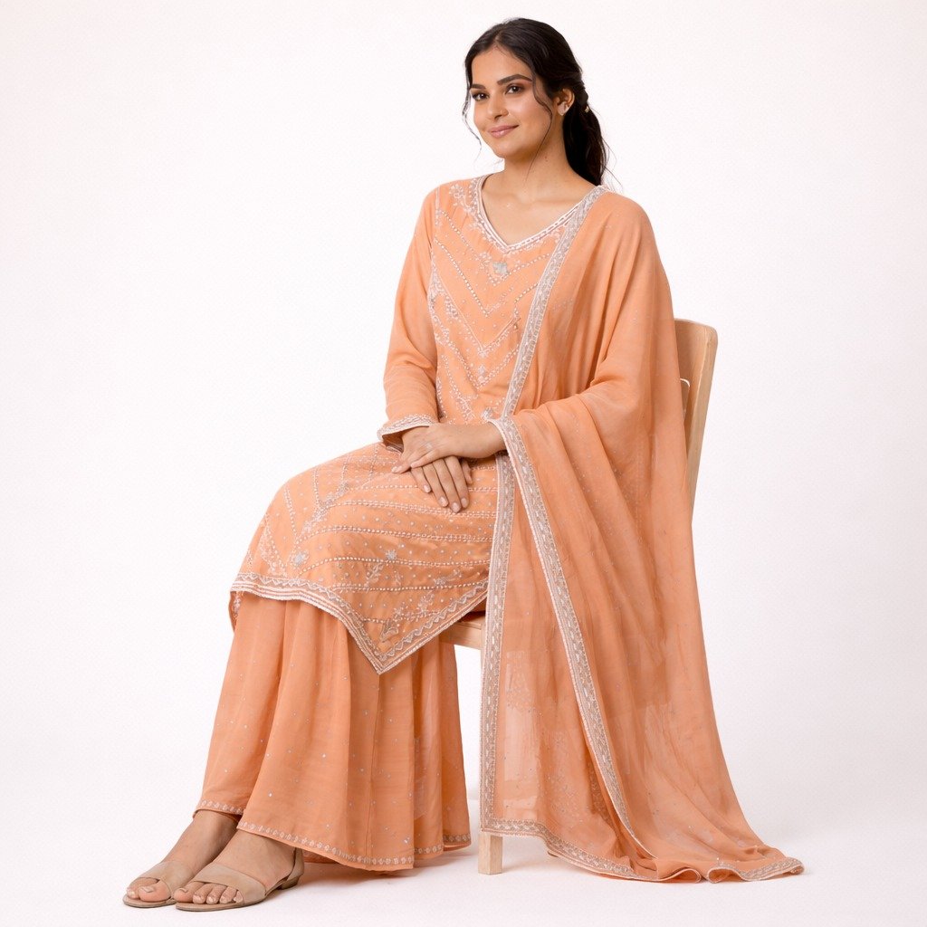 1 = Fabric: Star Georgette 2 = Top Length: 37 Inches 3 = Bottom Length: 43 Inches 4 = Dupatta: 2.5 Meter 5 = Style: Garara Suit 6 = Embroidery: Hand Work 7 = In Bag: Kurta, Garara and Dupatta Only 8 = Occasion: Wedding Wear, Party Wear, Festive Wear, Traditional Wear